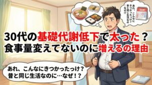 30代後半の基礎代謝は、20代前半と比べて約5〜10%低下する。基礎代謝とは「何もしなくても体が消費するエネルギー」のこと。これが下がると、同じ量を食べていても余ったエネルギーが脂肪として蓄積される。体が重くなり、動くのが億劫になり、さらに運動しなくなる。