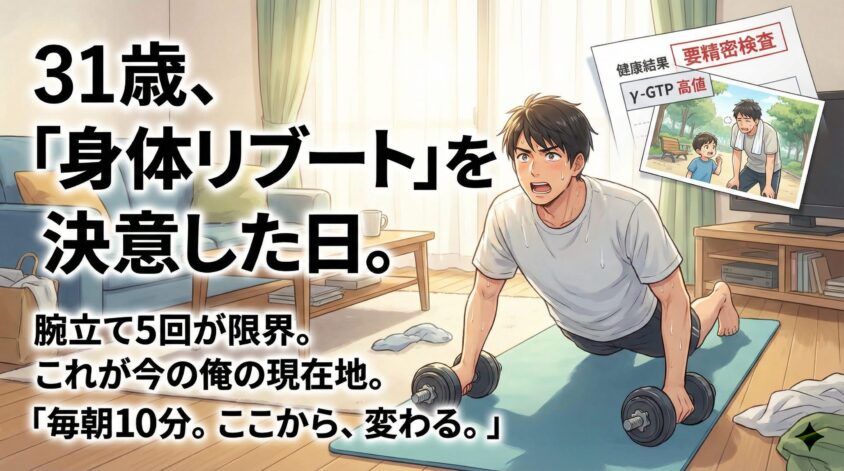 まず腕立て伏せをやってみた。1回、2回、3回……5回目で腕が震えて、顔面から床に突っ込んだ。腕立て5回。それが、31歳の俺の全力だった。