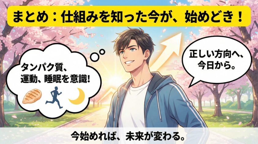 - 正しい方向を知れば、必ず対処できる。タンパク質を1食意識する、週2回15分動く、7時間寝る——この3つだけで、今日から始められる